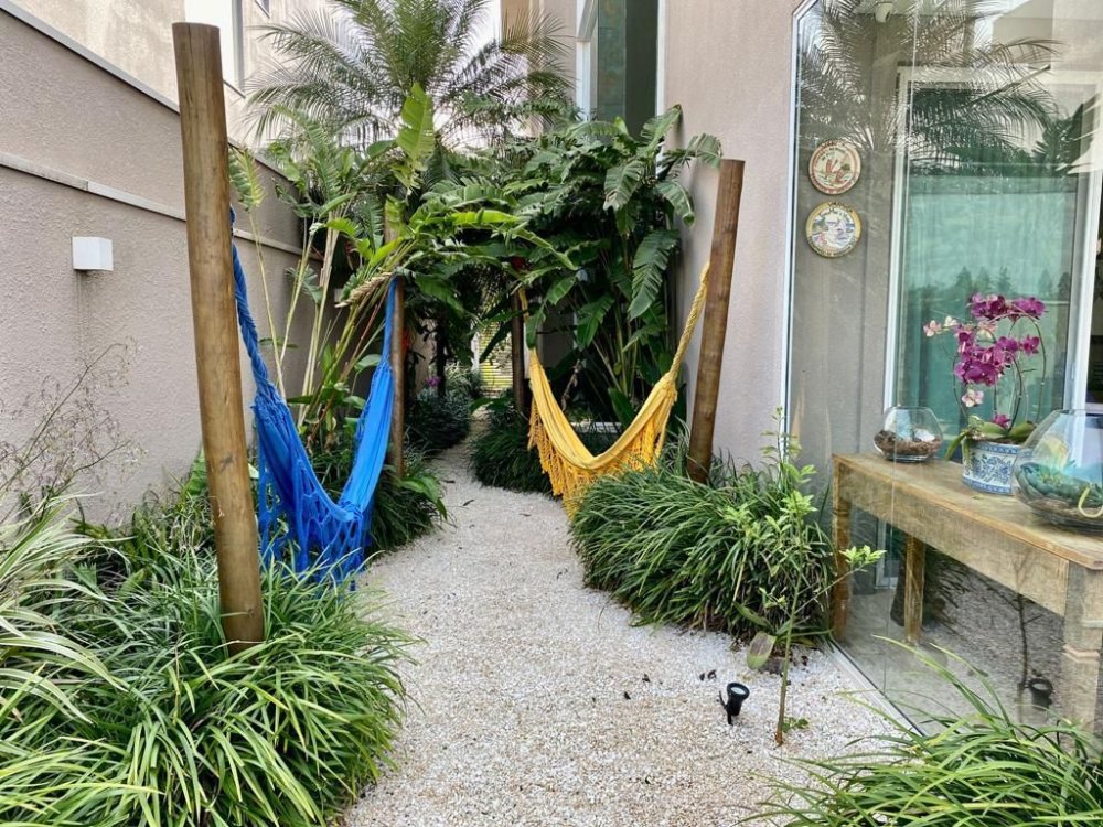 Espaço zen com fonte, redário, paisagismo, ducha vertical e Vestiário externo
