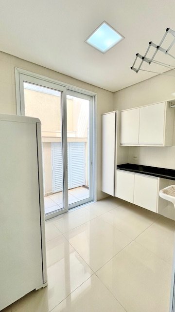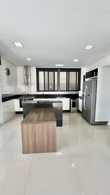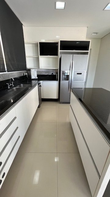 Cozinha completa com geladeira, fogão, coifa, microondas e lava-louças, frezer na área de serviço.