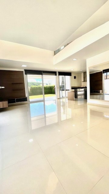 Sala com pé direito alto integrada com a cozinha e área de lazer.