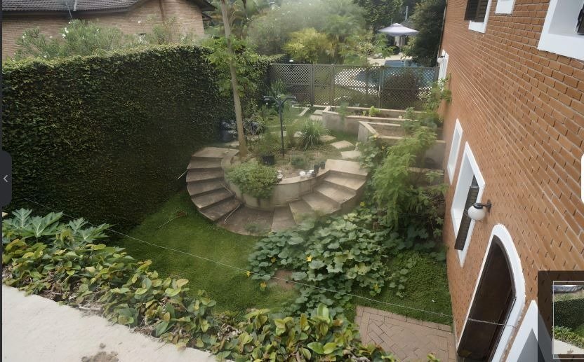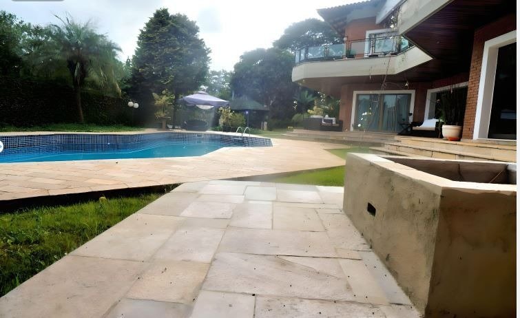 Ampla área externa com lazer completo: espaço gourmet novo com churrasqueira, cooktop e forno de pizza, bancadas em granito, piscina, pomar, horta e muita área verde, além de sala de ginástica, sauna e salão de jogos.