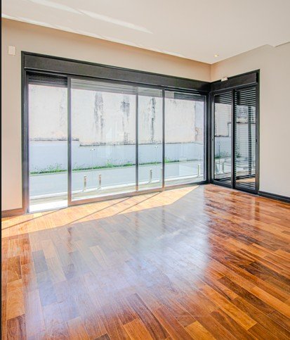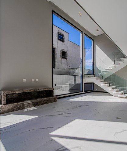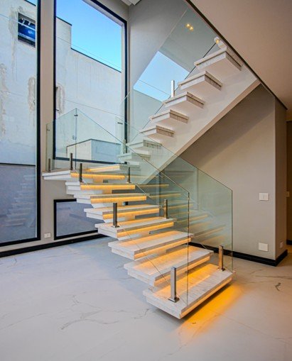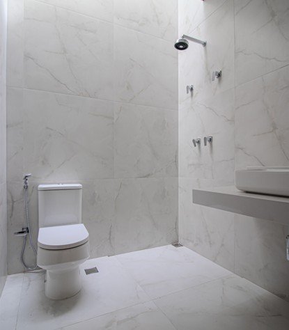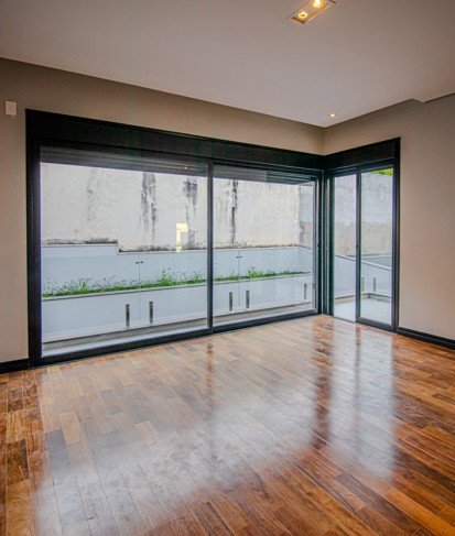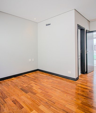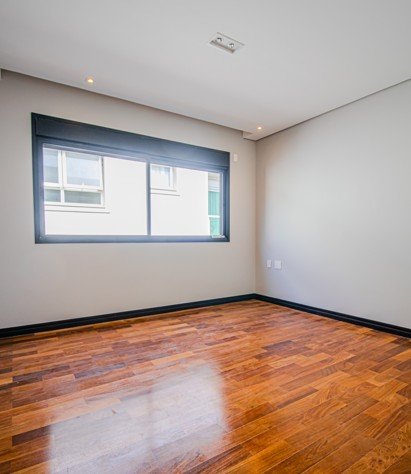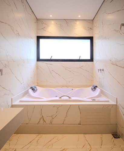 Esquadrias em alumínio preto, persianas automatizadas, louças e metais deca, porcelanatos 1,20 x 1,20, piso em taco de madeira cumaru nas suítes, mármore na escada e bancadas.