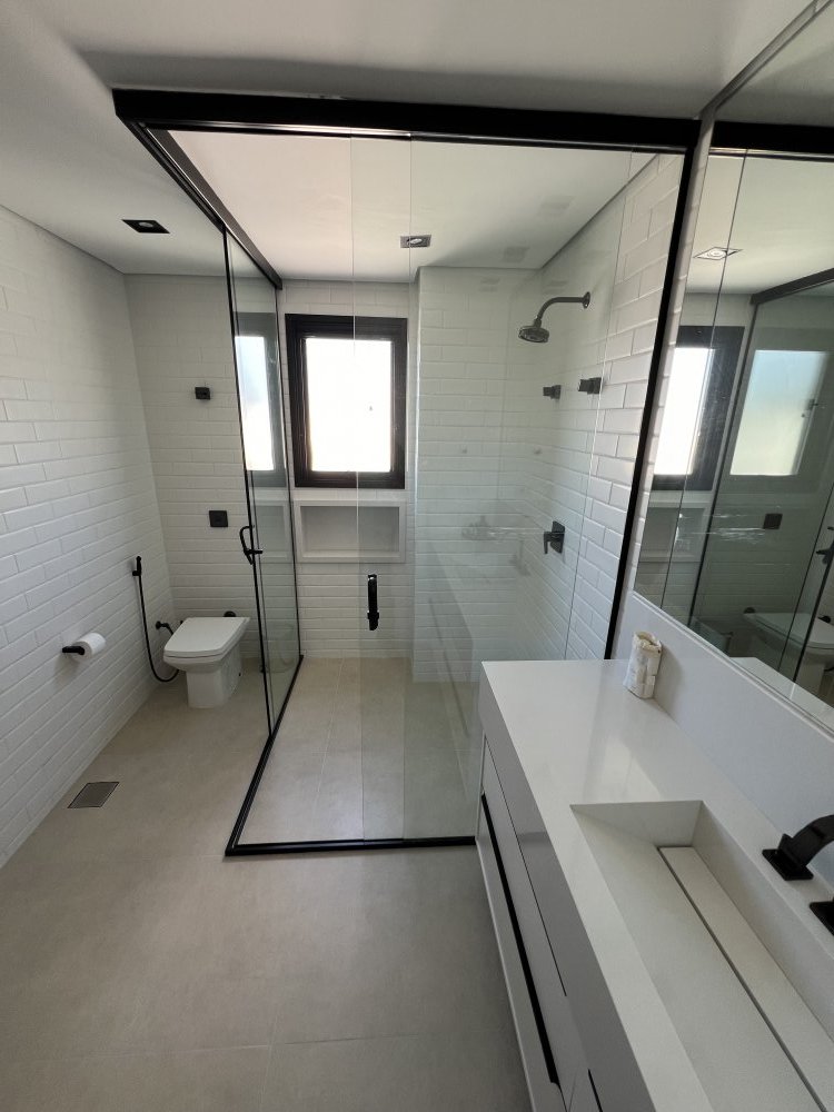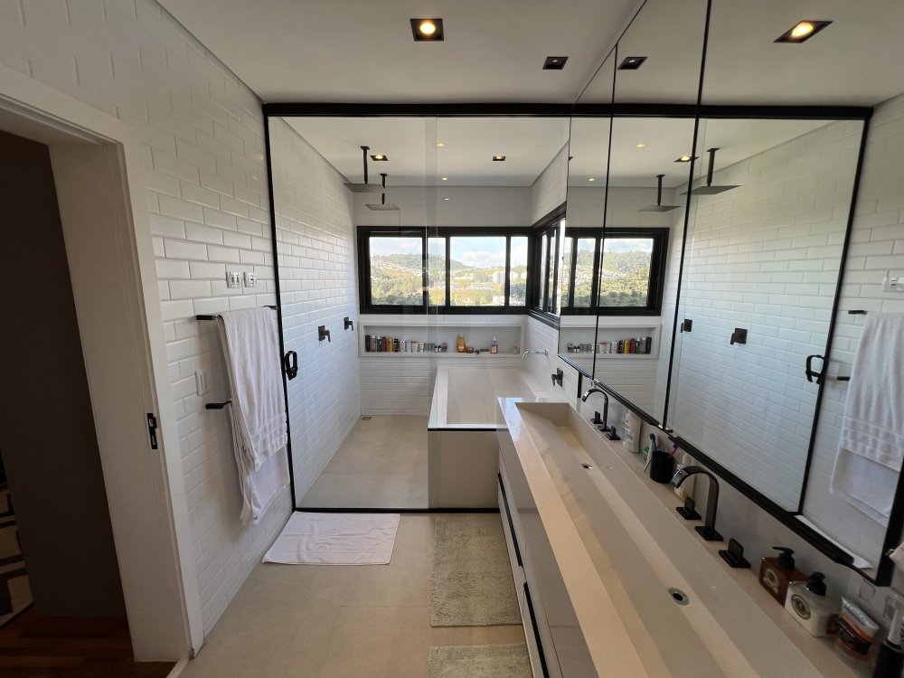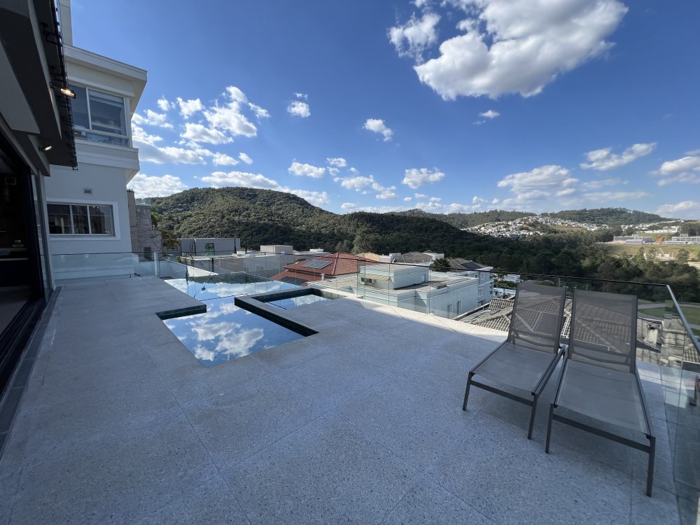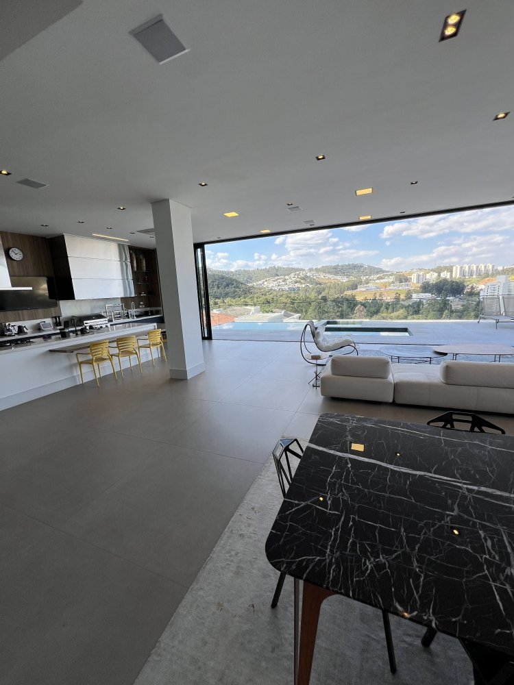482 m² de construção, 4 suítes repletas de armários, ar condicionado quente/frio (inverter) e persianas elétricas automatizadas, suíte master com closet fechado e banheira esculpida na pedra, living com é direito duplo e para três ambientes como sala de estar, sala de jantar e sala de TV, frente em vidro com vista panorâmica, piso em mármore travertino importado no Hall entrada, lavabo, área de serviço com lavanderia, escritório completo de marcenaria com copa exclusiva e teto ripado, ar condicionado automatizado quente e frio em todos os ambientes, sistema de automação completa da casa pré instalada, preparação do home com TV e tela de 120 polegadas, sistema Dolby Athmos com 8 alto-falantes, sala de jantar e espaço gourmet com sistema de som integrado com caixas importadas, cozinha gourmet integrada aberta repleta de armários com frente em vidro, espaço gourmet integrado com TV, churrasqueira a gás e carvão, banheiro de colaborador, quarto de apoio na cozinha, louças Deca, box nos banheiros até o teto, piscina com borda infinita 6m por 3m, com prainha e SPA.