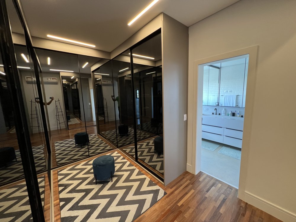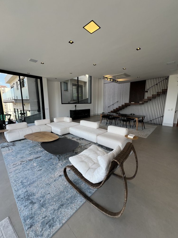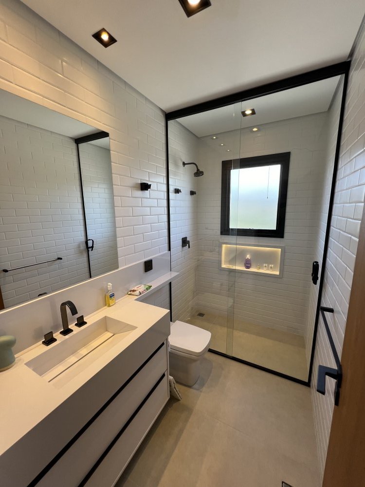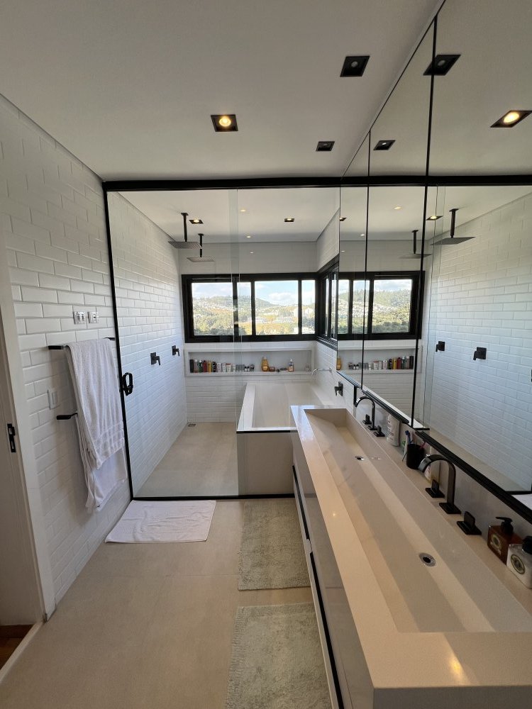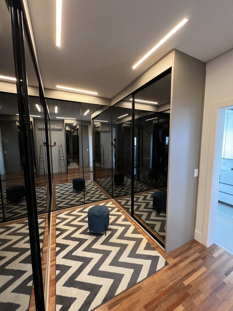 482 m² de construção, 4 suítes repletas de armários, ar condicionado quente/frio (inverter) e persianas elétricas automatizadas, suíte master com closet fechado e banheira esculpida na pedra, living com é direito duplo e para três ambientes como sala de estar, sala de jantar e sala de TV, frente em vidro com vista panorâmica, piso em mármore travertino importado no Hall entrada, lavabo, área de serviço com lavanderia, escritório completo de marcenaria com copa exclusiva e teto ripado, ar condicionado automatizado quente e frio em todos os ambientes, sistema de automação completa da casa pré instalada, preparação do home com TV e tela de 120 polegadas, sistema Dolby Athmos com 8 alto-falantes, sala de jantar e espaço gourmet com sistema de som integrado com caixas importadas, cozinha gourmet integrada aberta repleta de armários com frente em vidro, espaço gourmet integrado com TV, churrasqueira a gás e carvão, banheiro de colaborador, quarto de apoio na cozinha, louças Deca, box nos banheiros até o teto, piscina com borda infinita 6m por 3m, com prainha e SPA.