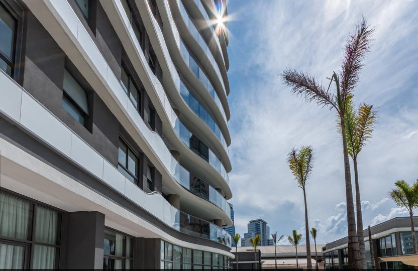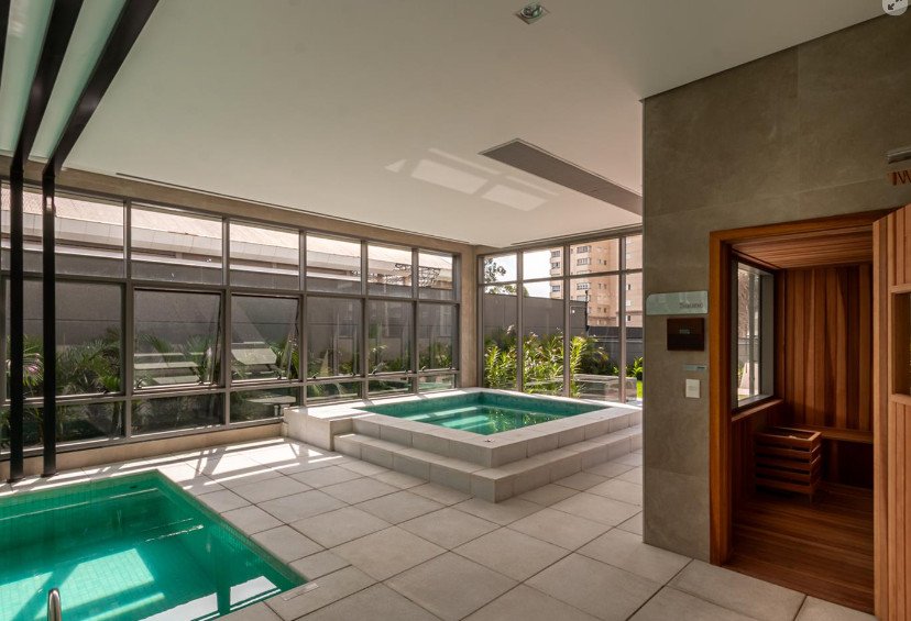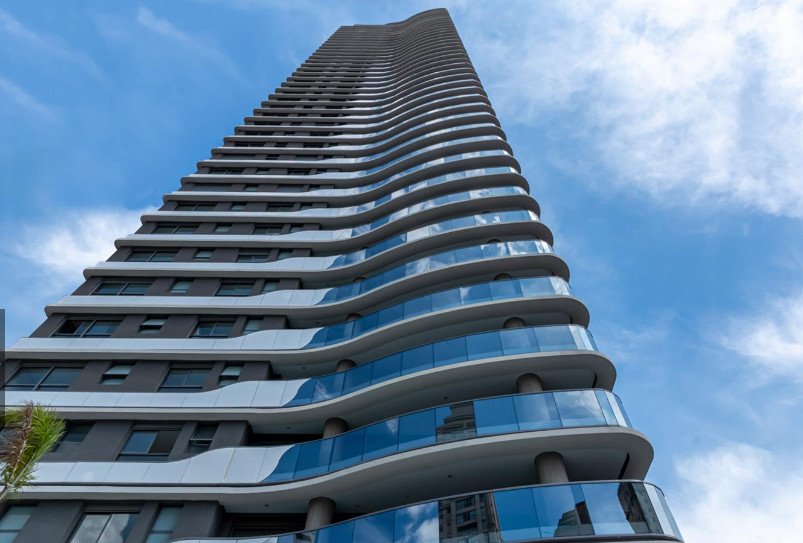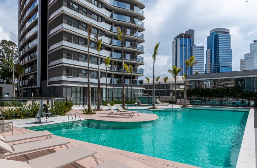 Prédio moderno com as funcionalidades dos prédios de luxo, como piscinas, áreas de recreação, salas de ginástica, jogos, quadras de tenis, etc
