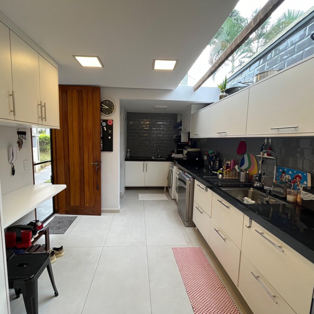 A casa foi inteira modernizada internamente com atualização da cozinha, que foi ampliada e integrada com a sala de jantar, tendo sido trocado todo o revestimento e piso; A iluminação natural da claraboia na cozinha é um destaque do ambiente.