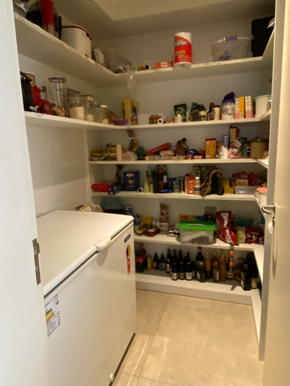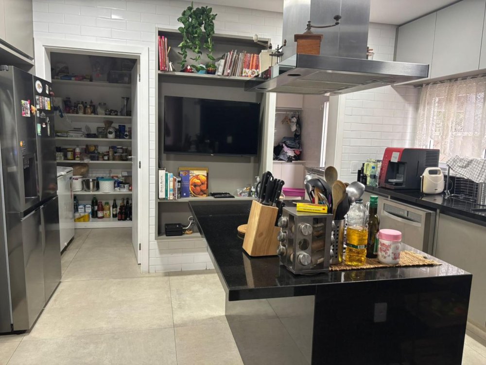 Cozinha com eletrodomésticos (irá retirar a geladeira), despensa, área de serviço repleta de armários.