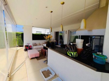 Varanda Gourmet com churrasqueira e toldo de proteção