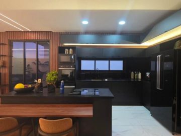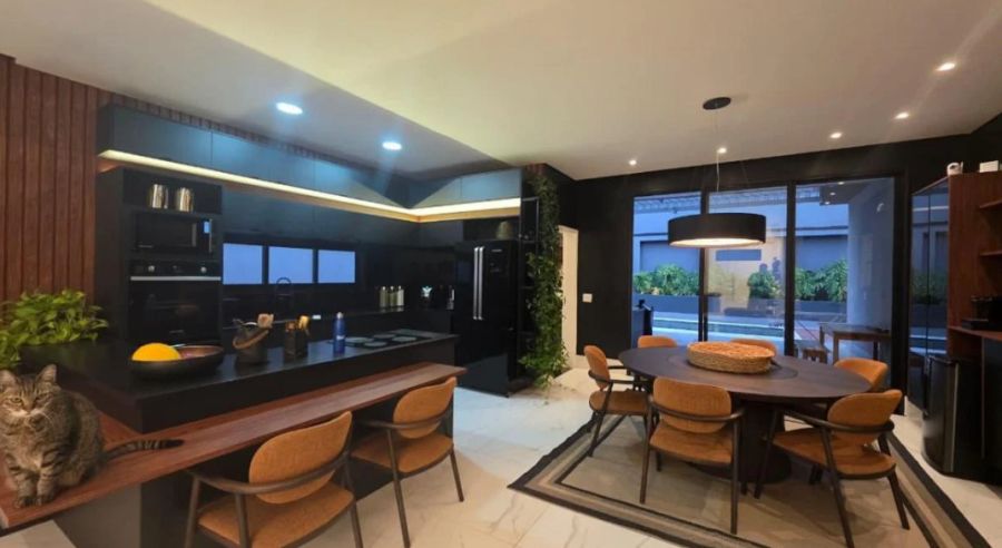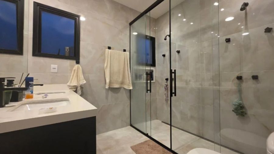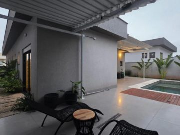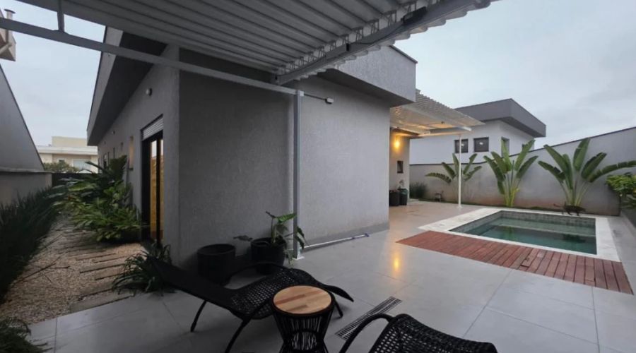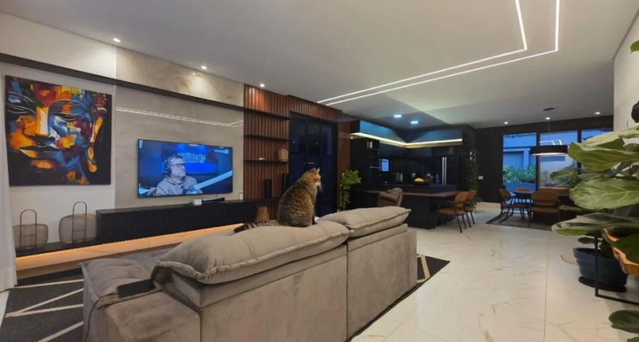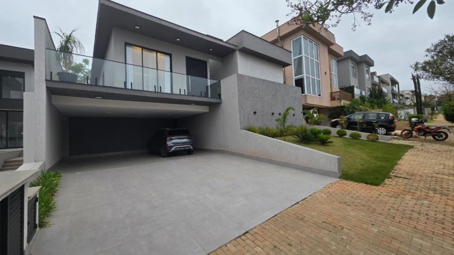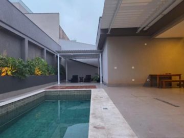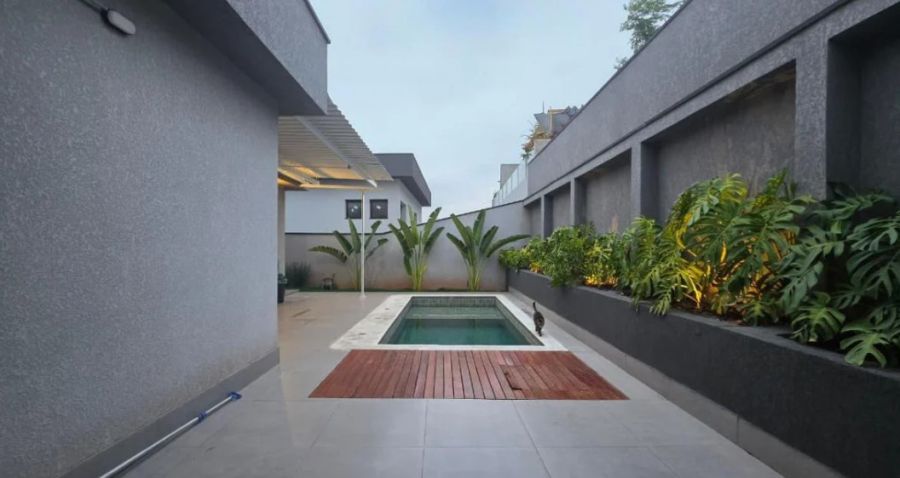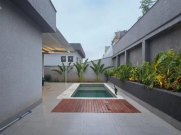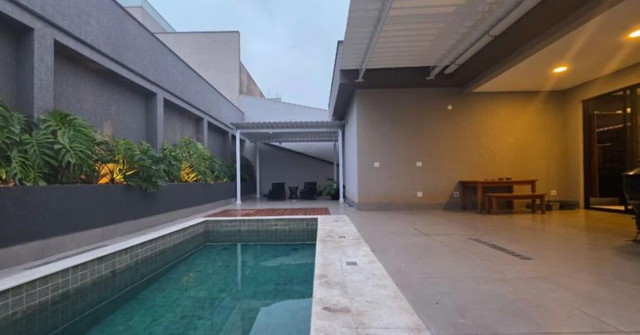 Moderna com 280 m2 de construção em 473 m2 de terreno, 3 suítes, sala e cozinha integradas, lavabo, varanda gourmet com churrasqueira à carvão, piscina, banheiro área externa/piscina, jardim, área de serviço, garagem para 4 carros e depósito.