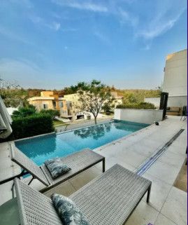- Piscina na frente da casa com iluminação, prainha e borda infinita.