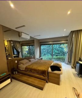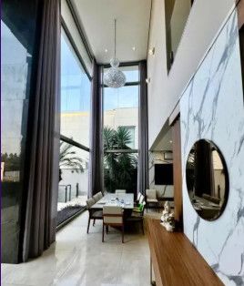 Casa diferenciada, com acabamentos de alto padrão, sala com pé direito triplo em vidro, mobília de qualidade.
