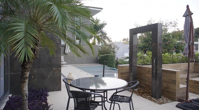 - Piscina com borda infinita, iluminação, prainha e ducha cascata