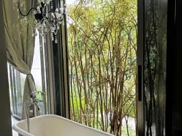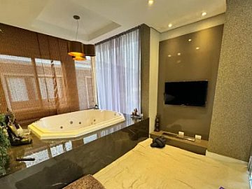 - Suíte master ampla com 45 m2 e amplo closet integrado, banheiro com banheira de imersão com linda vista para o paisagismo.