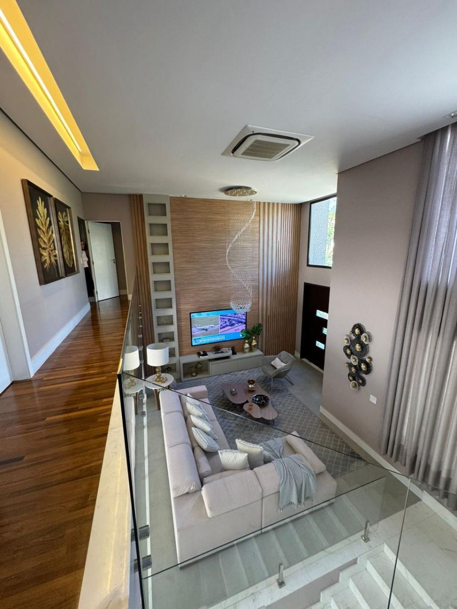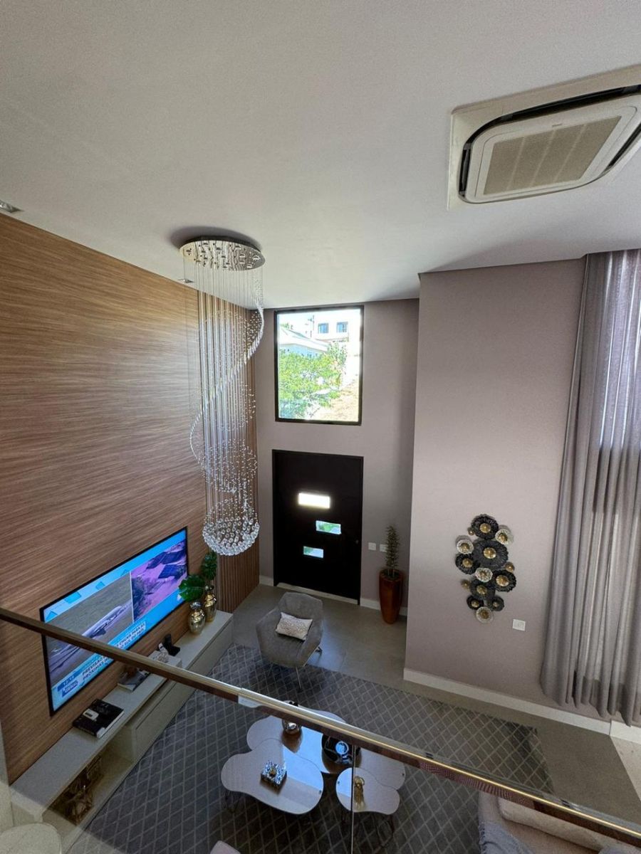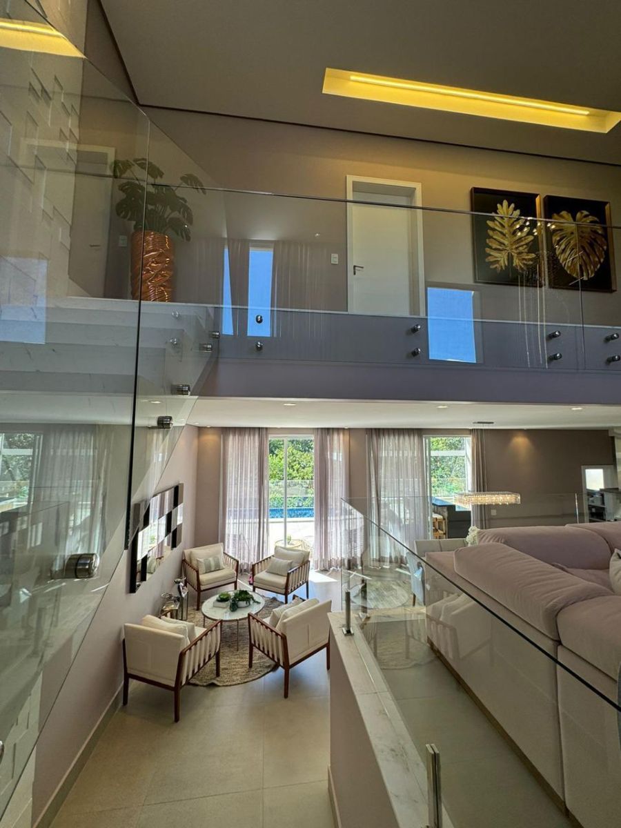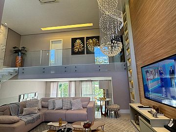 Sala ampla com pé direito alto e vários ambientes, perfeita para receber com estilo e conforto