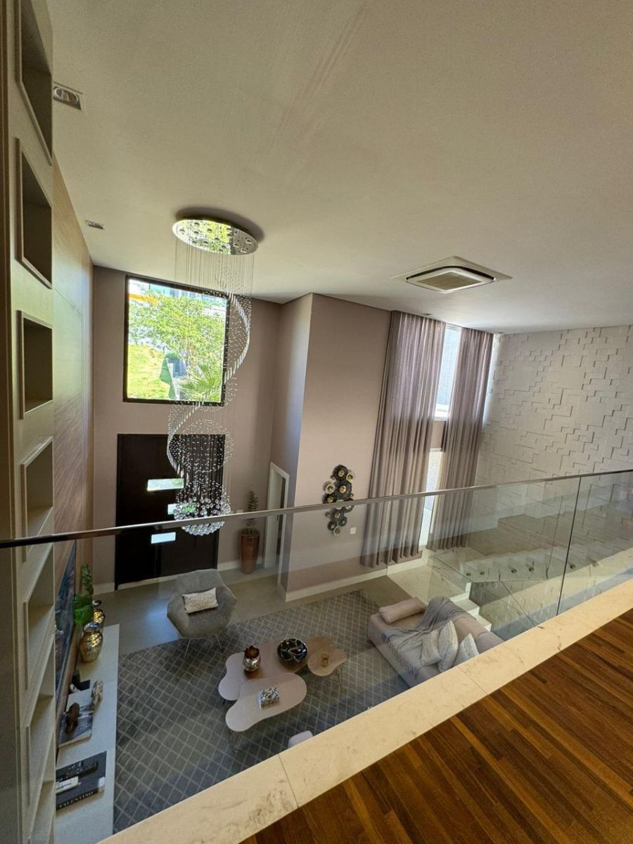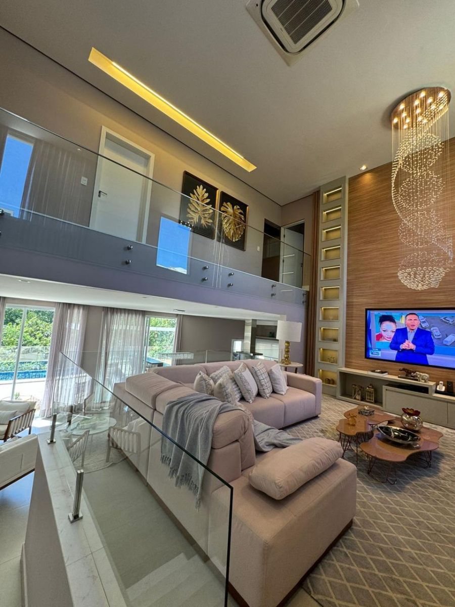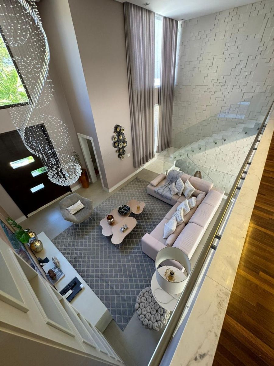 Sala ampla com pé direito alto e vários ambientes, perfeita para receber com estilo e conforto