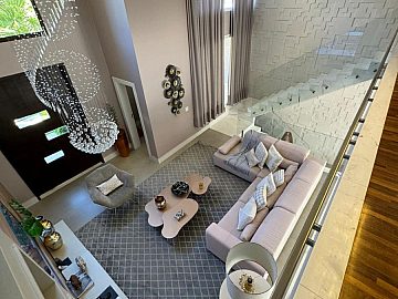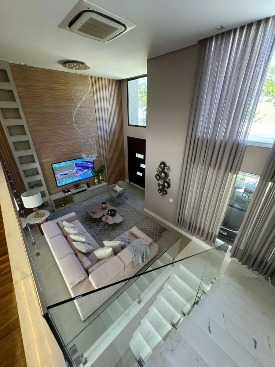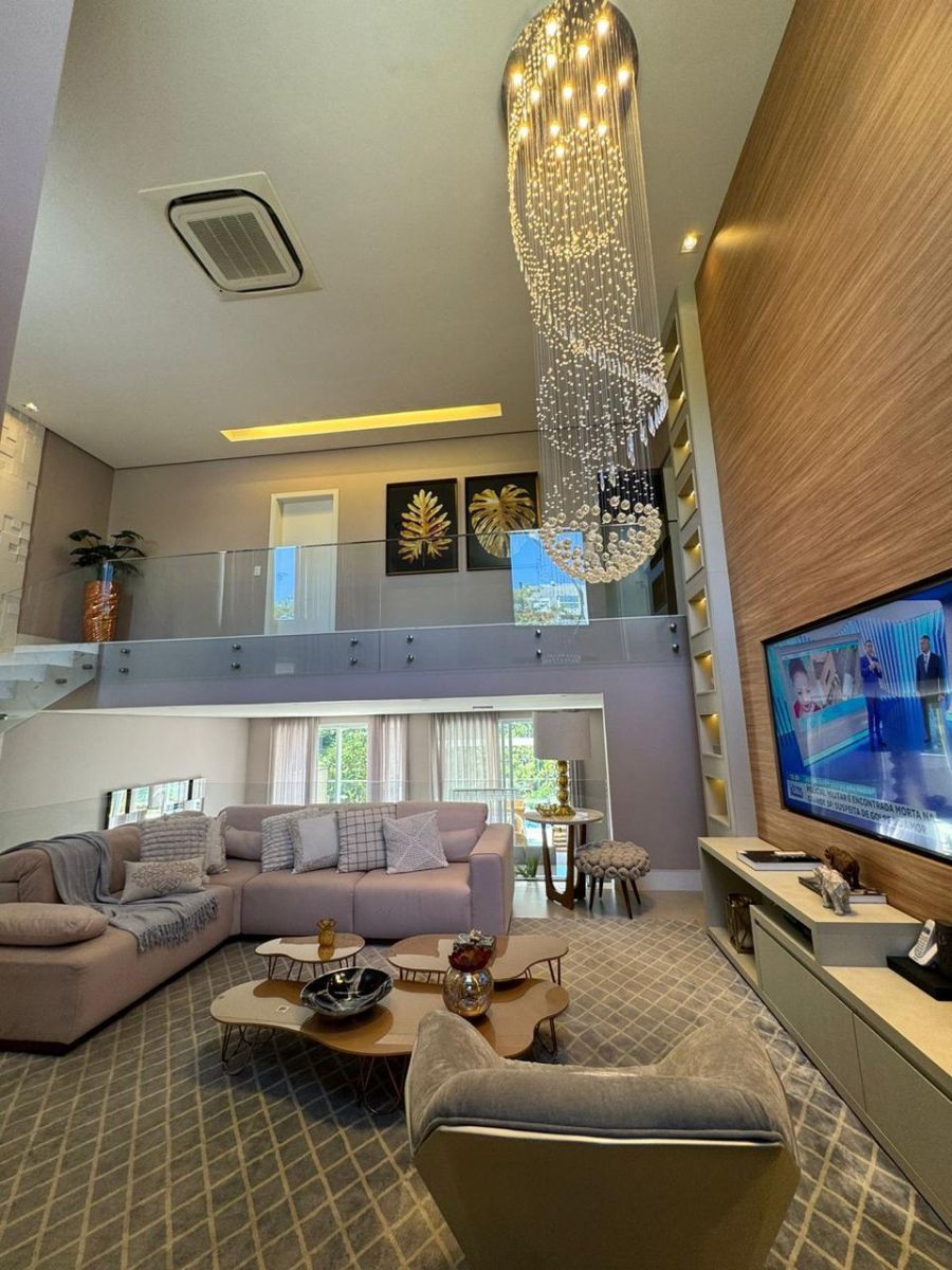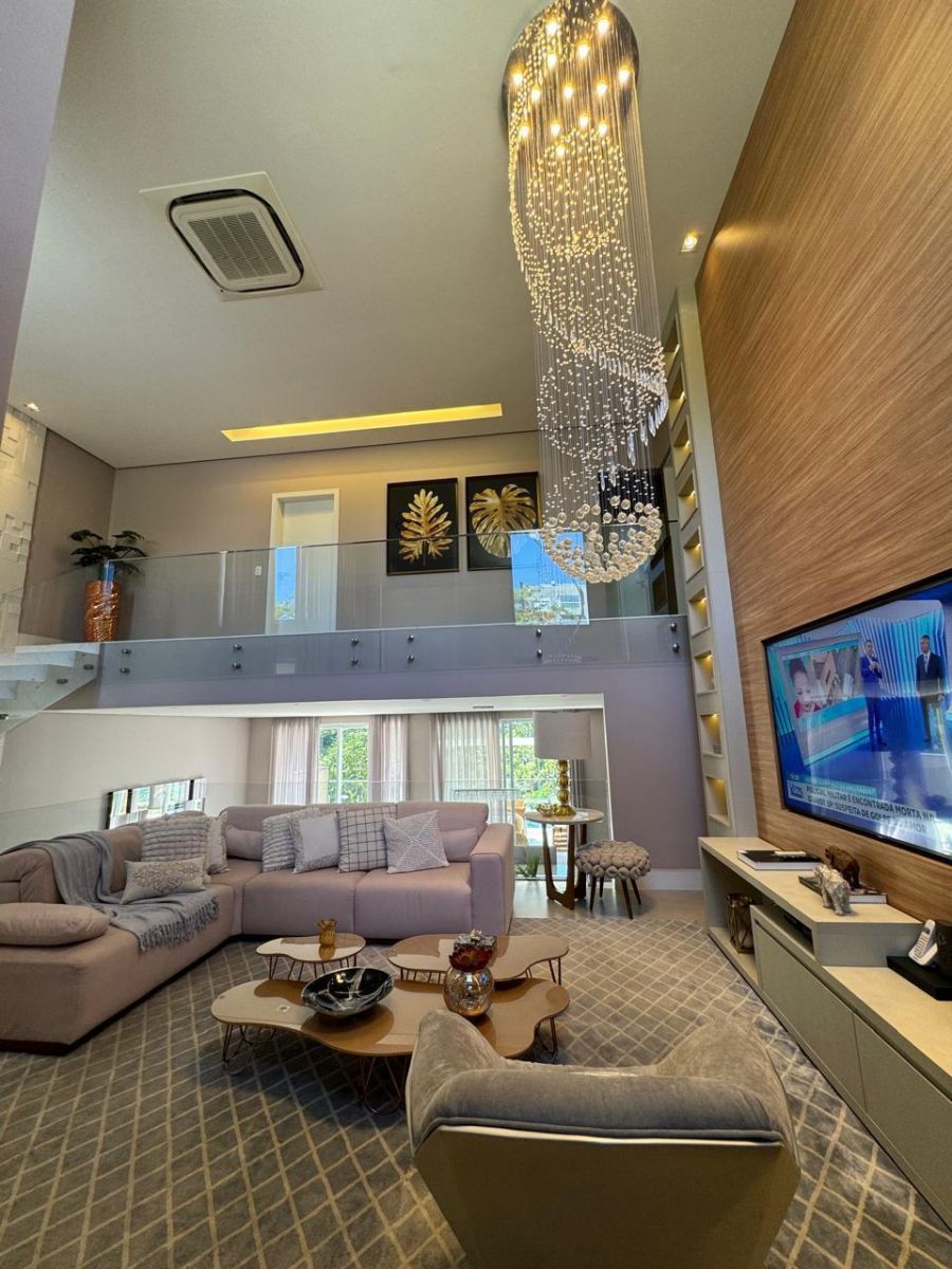 Sala ampla com pé direito alto e vários ambientes, perfeita para receber com estilo e conforto
