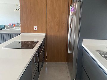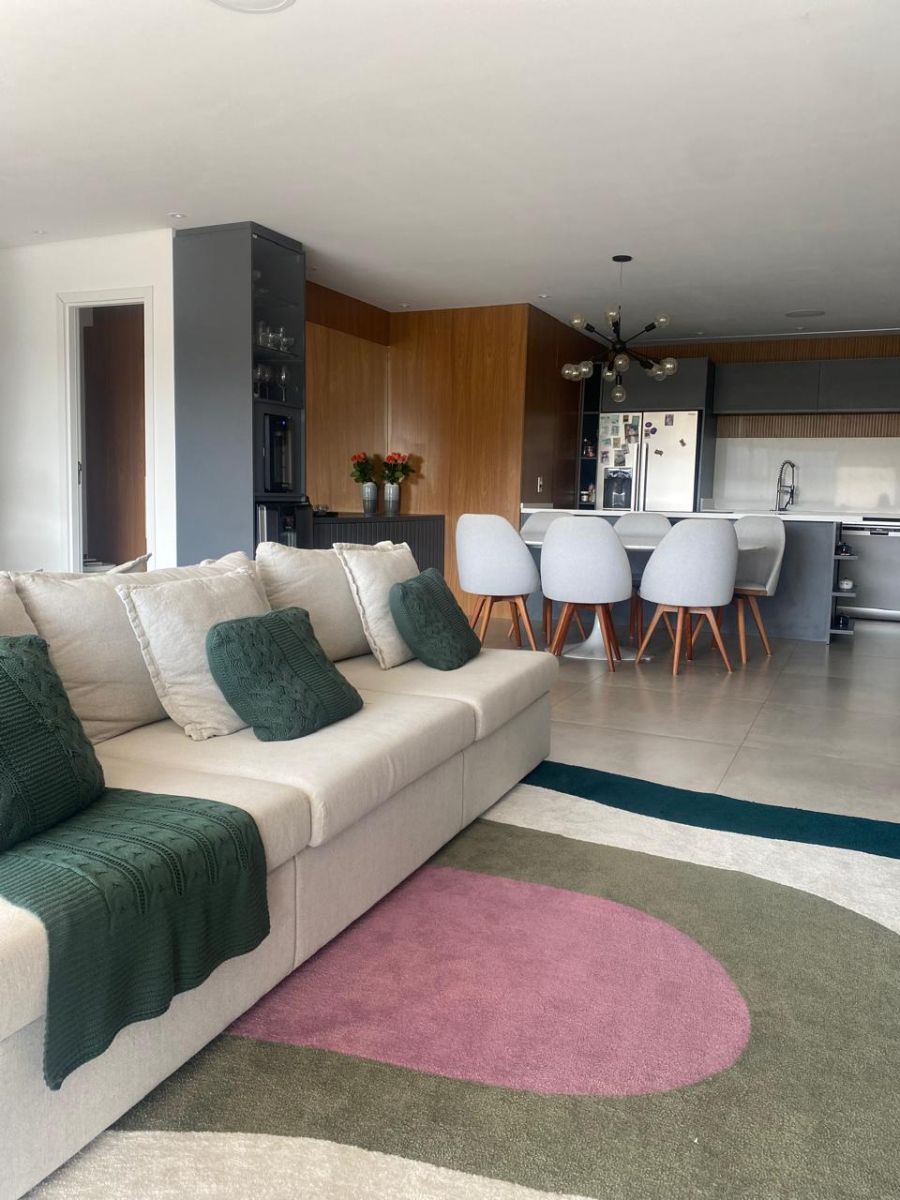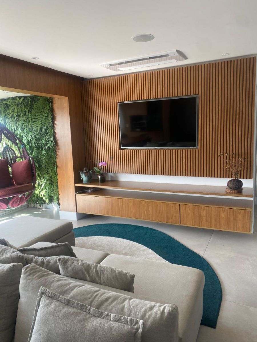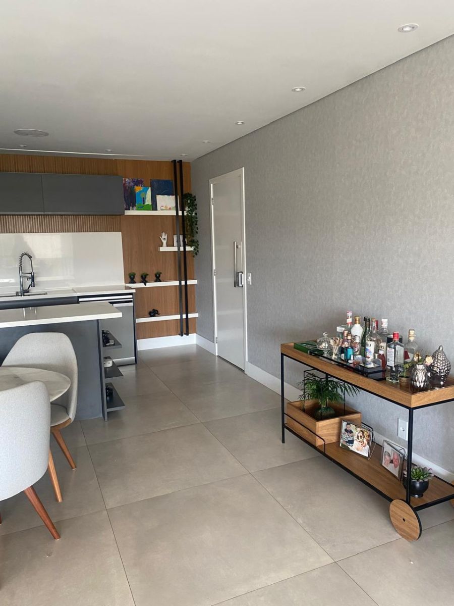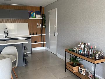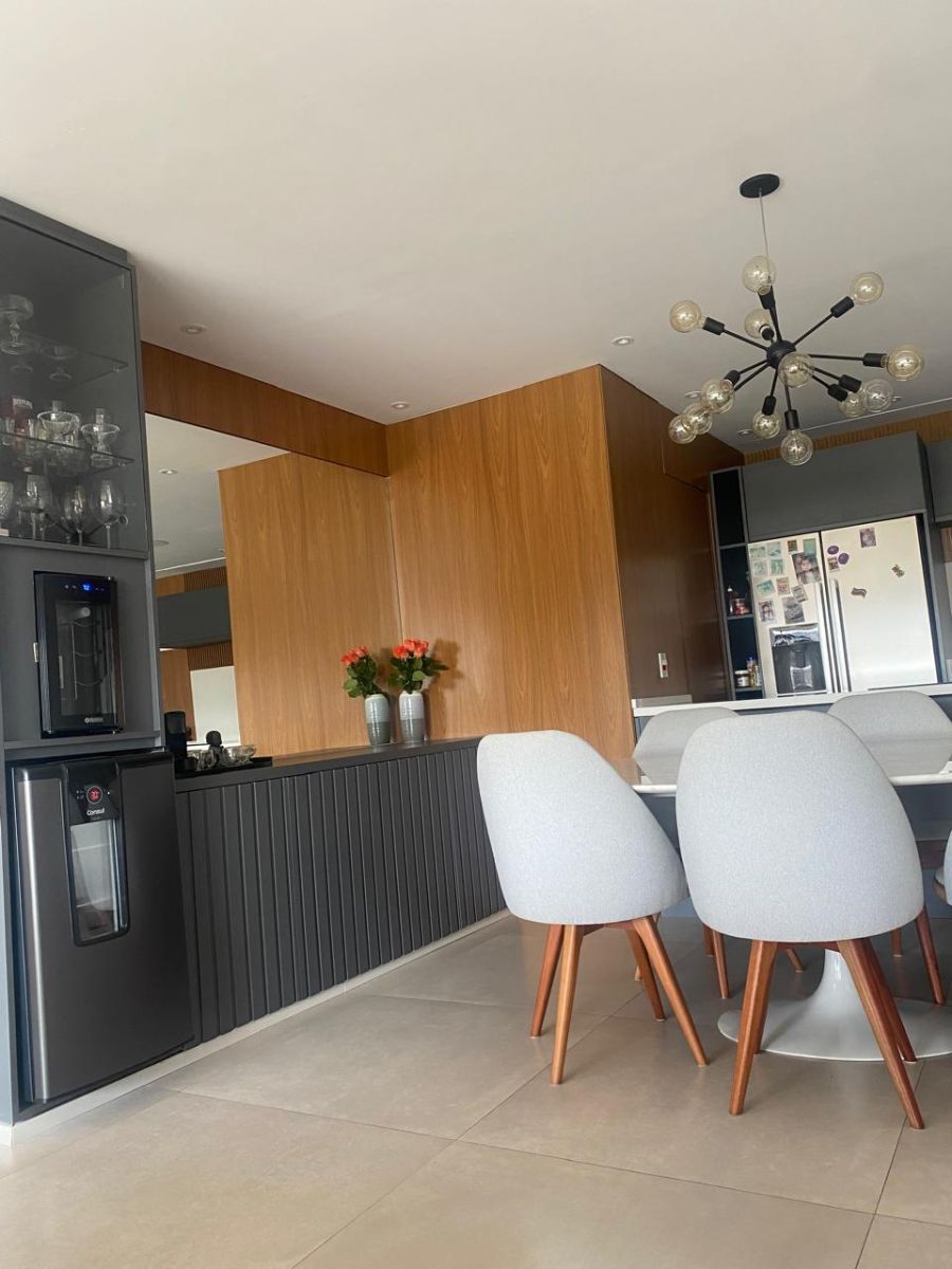 Total 110 m² com 2 suítes e sala ampliada, lavabo, cozinha com geladeira, forno e microondas, varanda gourmet, área de serviço, 2 vagas de garagem