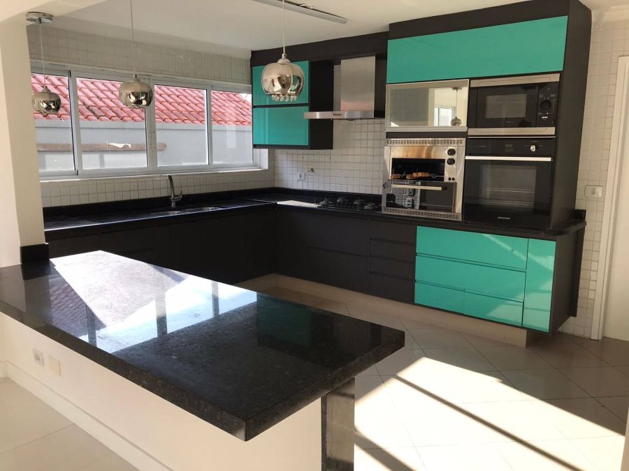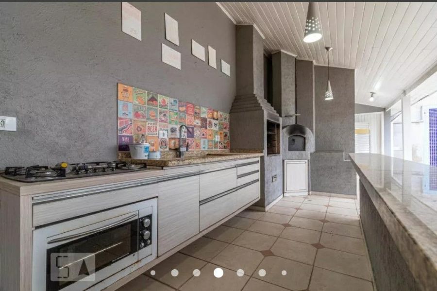 Cozinha americana/aberta com churrasqueira a gás, forno elétrico e microondas embutidos.