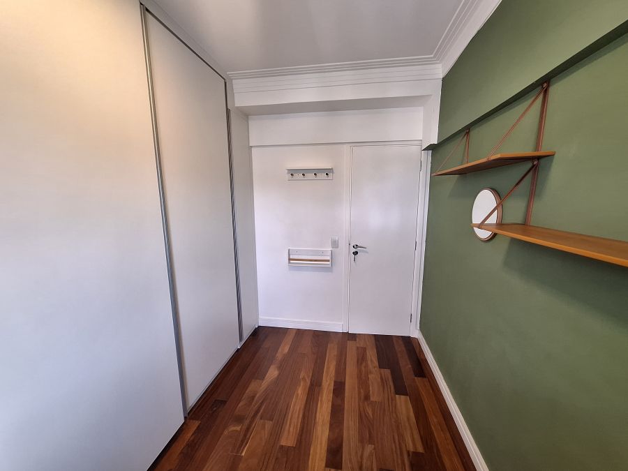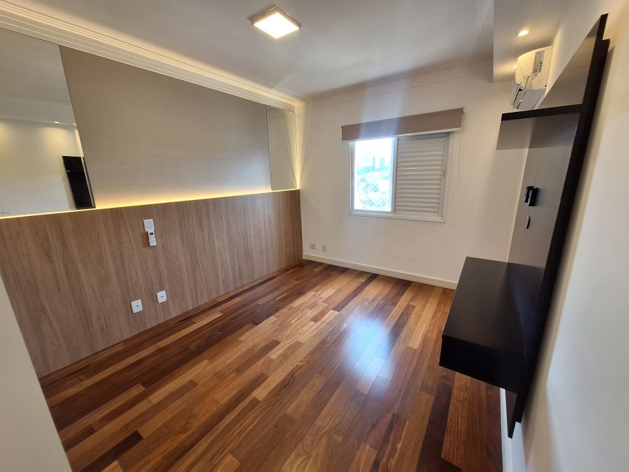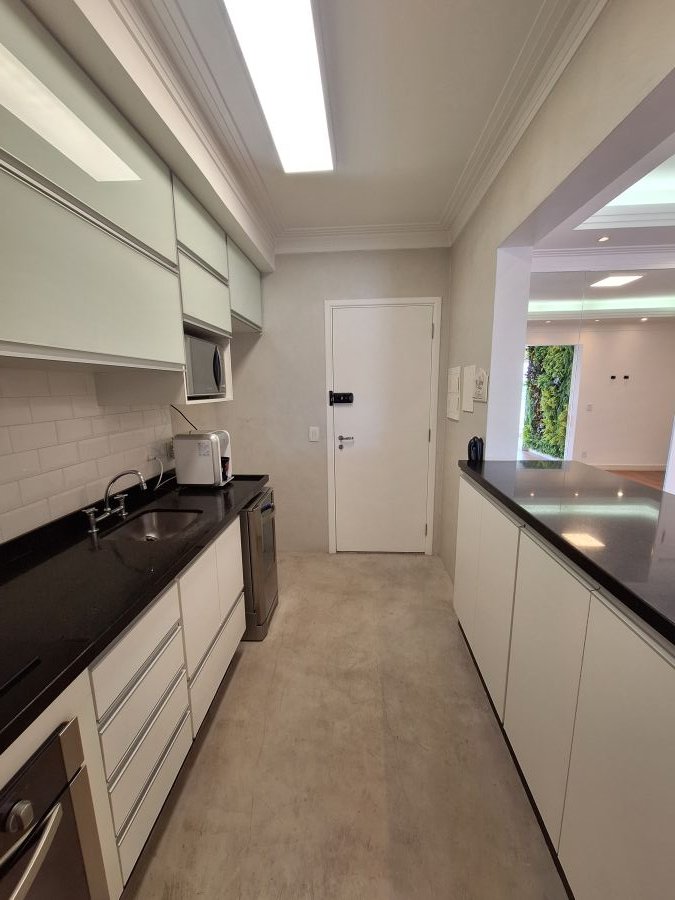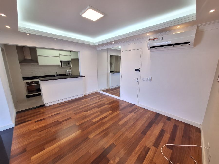 O apartamento também conta com ar condicionado, armários planejados e cozinha equipadada.