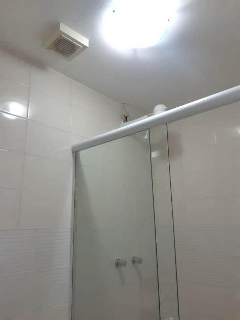 Armários na cozinha, box de vidro e espelhos nos banheiros.